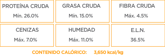 Arroz, harina de carne de pollo, maíz, grasa de pollo, concentrado de proteína de soya, pulpa de remolacha, levadura de cerveza, harina de pescado, sabor natural de pollo, aceite de pescado, harina de huevo, fósforo, sodio, mananooligosacáridos, fructooligosacáridos, celulosa, lisina, metionina, taurina, glutamina, treonina, cloruro de colina, calcio, potasio, suplemento de vitamina A, colecalciferol, acetato de DL-alfa tocoferol, complejo de bisulfito sódico de menadiona, mononitrato de tiamina, riboflavina, ácido nicotínico, clorhidrato de piridoxina, cianocobalamina, D-biotina, pantotenato de calcio, ácido fólico, glicinato de hierro, glicinato de manganeso, hidroxianálogo de seleniometionina, glicinato de cobre, glicinato de zinc, dihidroyoduro de diamino etileno, extracto de Yucca schidigera, romero y tocoferoles como conservadores.