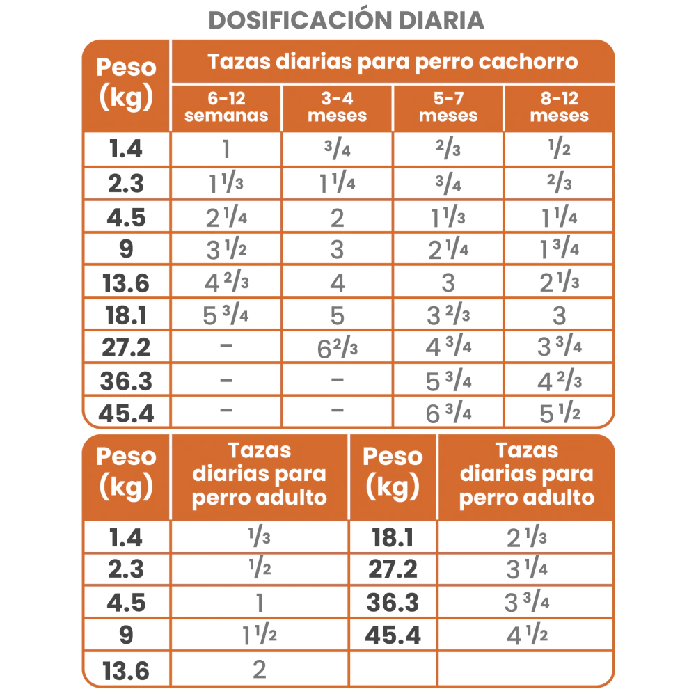 Proteína bruta: 28% mínimo Grasa bruta: 17% mínimo Fibra bruta: 5% máximo Humedad: 10% máximo DHA: 0.05% mínimo Omega 6: 2.8% mínimo Omega 3: 0.3% mínimo Probióticos vivos: 1,000,000 CFU/lb